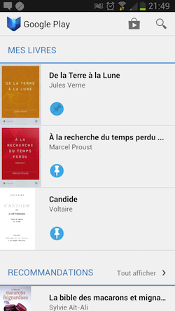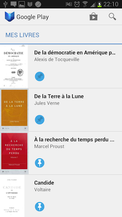 En ce qui concerne la gestion de vos eBooks, chaque ouvrage acheté via le Play Store se rajoute automatiquement à votre bibliothèque personnelle sur l’application Google Play Livres. Enfin, vous pouvez consulter vos ouvrages hors ligne (c’est-à-dire sans avoir de connexion) si vous les avez téléchargés. Pour cela, il vous suffit dans l’application Google Play Livres de cliquer sur la petite icône en forme d’épingle. Quand celle-ci est colorée en bleu, c’est que votre livre est consultable sans connexion internet.