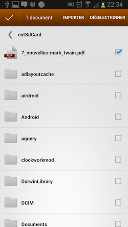 Une fois le fichier transféré sur votre terminal, ouvrez l’application Aldiko Book Reader puis sélectionnez la rubrique « Fichiers ». Recherchez le fichier sur votre téléphone à l’emplacement où vous l’avez mis. Cochez la case à gauche du document et cliquez sur « importer ».