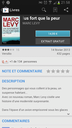 Naviguez alors par thématique ou effectuez une recherche pour trouver l’ouvrage qui vous convient. Achetez le (pour savoir comment faire une acquisition sur le Market, suivez notre tutoriel dédié ici). Cliquez ensuite sur ouvrir. L’appli Google Play Livres se lance alors automatiquement et vous pouvez profiter de votre livre.