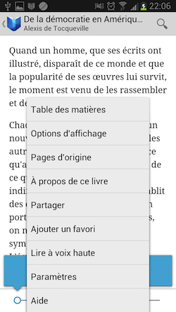 Au cours de votre lecture, vous avez la possibilité d’ajouter des favoris (des marque-pages en réalité) en appuyant sur le bouton « Menu » de votre terminal. Avantage, les favoris sont synchronisés sur tout vos comptes. Vous pouvez ainsi par exemple stopper votre lecture à un moment donné sur votre smartphone et la reprendre plus tard sur votre tablette.