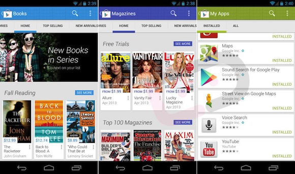 Il faut dire que la boutique en ligne de la firme de Mountain View n’avait plus connu de réelle refonte depuis la sortie en juillet 2011 de sa version 3. Et, il y a un an, lorsque le Market Android disparaissait pour laisser place au Play Store, une boutique regroupant tous les services proposés par Google (des applications à télécharger donc mais aussi des films, de la musique, des livres, etc.). Depuis, quelques ajouts ont bien été apportés (comme la liste de souhaits ou encore les mises à jour des applications allégées) mais l’interface était restée relativement similaire. Seuls de nouveaux services avaient fait progressivement leur apparition sur la version française : Google films, Google Livres (en juillet 2012) puis Google Music, en attendant Google Magazines dans le courant de cette année.
