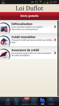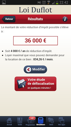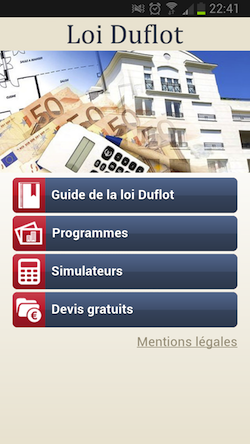 « Loi Duflot » est une application destinée aux futurs acquéreurs de biens immobiliers neufs qui souhaitent les mettre en location en profitant au mieux du dernier dispositif de défiscalisation du gouvernement. Très pratique pour faire une première estimation.