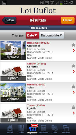 Gros point fort de l’application, une rubrique de recherche permet de trouver facilement les programmes immobiliers compatibles dans les villes qui vous intéressent. Une vraie mine d’or : au moment où nous avons effectué ce test, près de 1.400 programmes étaient recensés !