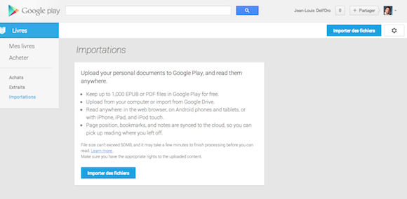Au total, vous aurez la possibilité de stocker jusqu’à 1.000 livres numériques (dans la limite de 50 Mo par eBook). Avant de commencer, vous devrez vous rendre, depuis votre ordinateur, sur une page spéciale du Play Store réservée aux livres ici. Cliquez ensuite sur « importer des fichiers ».